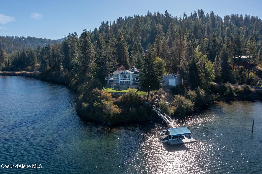 Discover your escape at at Carlin Bay at this Lake Coeur d'Alene home, set along over 900 feet of pristine shoreline. This property features four bedrooms and three and a half baths, providing ample space for gatherings. The exterior boasts a private dock, perfect for boating, fishing, or swimming. A two-car garage and a spacious 20 x 50 heated shop offer plenty of storage and workspace. Large windows throughout the home ensure stunning views of the lake and natural surroundings. Enjoy the outdoors on the covered deck or patio, ideal for relaxing or dining while soaking in the scenery. The property's natural landscaping enhances its tranquil atmosphere, complete with a fire pit and outdoor seating area. Inside, an open floor plan connects living areas, creating a spacious and inviting environment. Rustic charm is evident in the use of natural materials, including wood and stone. A central fireplace adds warmth and comfort to the home. Experience the serenity of lakeside living!