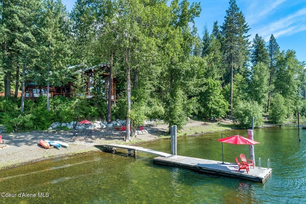 Spectacular Timber Post & Beam TAMARACK Log LUXURY WATERFRONT beauty with a SANDY BEACH and 155 waterfront feet on the East Side of Coeur d'Alene Lake near Carlin Bay. Open plan design with Idaho Stone floor-to-ceiling 2-story Fireplace with stunning log mantle; 3 bedrooms, 2 full baths and oversized 3-car tandem garage with shop workbench and a pass-thru back door to the Lake! Boasting a low bluff with very few steps to a level beach with western views and BRAND NEW DOCK coming Fall 2025. The East side allows for moresun and magical sunsets. End of the cul-de-sac location ensures maximum privacy and tranquility. Gourmet kitchen with high-end appliances and finishes make it a chef's dream. Owner will carry note @ 5% int with half down. nearly 3000 SF on over 1/2 acre, this waterfront rustic luxury retreat is a dream come true for those appreciating living life to the fullest in your own Private Idaho. Please, no drive-bys. North Idaho Lakefront at its best.