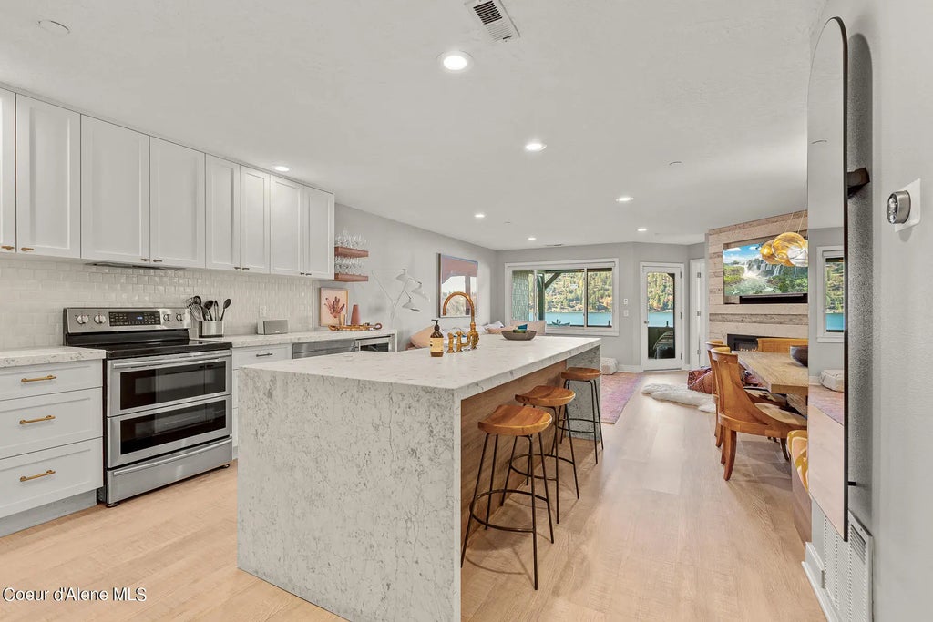 Ground floor 3 bedroom Arrow Point condo with a high end remodel. Great views of Lake Coeur d'Alene, easy ground floor access. Marble tile primary walk in shower, Waterworks plumbing fixtures, waterfall style breakfast bar, built in wine cooler, stacked washer and dryer. Ready for immediate occupancy, bring your toothbrush! Sold fully furnished.