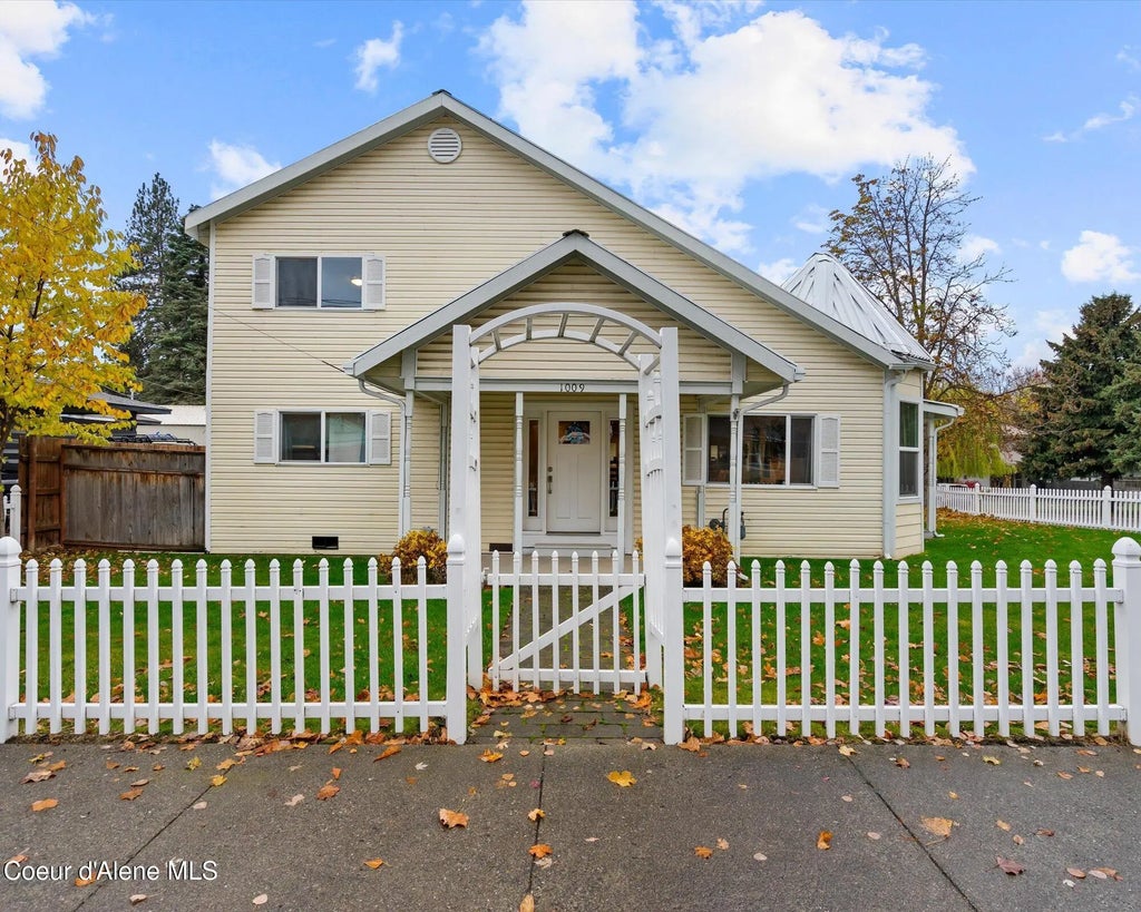 Stunning & spacious CDA home on a corner lot, with designer updates throughout! Enter into an open main floor with modern flooring, charming shiplap feature wall, large living room with cozy gas fireplace, sunny dining room, & a designer kitchen boasting a large island with seating, upgraded SS appliances, & a gas range. The main floor also features a half bath, laundry, & 2 bedrooms including the delightful primary suite with a stunning 4-piece bath & walk-in closet. Head upstairs to 2 more good-size bedrooms, & a modern full bathroom with lovely tile detail throughout. Outside is a private backyard oasis with a deck, covered patio, relaxing hot tub, garden space, flagstone pavers, & a charming covered side porch overlooking the manicured lawn & white picket fencing. Don't miss the large detached 2 car garage! Conveniently set near schools, parks, shopping, dining, & commuter routes. Updates include a recently-replaced HVAC unit & hot water heater. All furniture included in the sale!