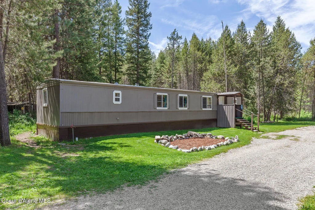Come see this thoughtfully remodeled, partially furnished 3 bedroom 1 bath mobile home with an addition for comfortable living space on its own 5.89 acre parcel featuring grassy lawns, a sand volleyball court, horseshoe pit, zip line, fire pit, cook out area, and numerous groomed trails. Surrounded by trees for privacy in a development offering quality community water and road maintenance, discover this unique property's potential. The existing home is positioned towards the side of the property so you could still build a new home and/or shop in the center of the land. You could then use the mobile home for income or as a second home for family. Home features include all appliances, laminate flooring, custom trim and supports, vinyl windows, updated water heater, elastomeric roof coating, gutters, and more. Land features also include 2 storage sheds, frost-free hydrants, and harvestable produce including morel mushrooms, wild strawberries, Oregon grapes, and saskatoons. All located 40 minutes to Sandpoint or Coeur d'Alene.