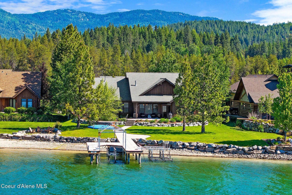 Nestled in the highly coveted West Dover Bay neighborhood along the picturesque Pend Oreille River, this stunning waterfront residence is a true gem. The single-level custom-designed home boasts 3 beds, 2 baths & showcases exceptional wood & stone finishes throughout. Upon entering the foyer, you are immediately struck by the vaulted ceilings & the floor-to-ceiling stacked rock fireplace in the living room, creating a warm & inviting ambiance. The bright & spacious kitchen features a large island, granite counters, ss appliances, & sliding glass doors that open onto the covered patio. The primary suite is incredibly spacious, offering gorgeous views, a walk-in closet, & a spa-like bathroom, complete w/ a soaking tub, walk-in shower, & an exterior door for lakeside convenience. Entertaining is made easy w/ an expansive patio, hot tub, & tranquil landscaping with a lush lawn extending out to the private dock, complete w/ a boat lift & 2 jet ski lifts. Attached 3-car garage.