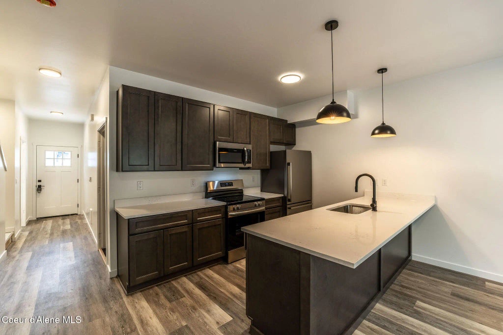 Welcome to Torrey Pines at The Village Condominiums, where modern living meets comfort in Coeur d'Alene's newest owner-occupied townhomes. This beautiful 2 bedroom, 2.5-bathroom unit features 1298 sqft of living space with an attached heated one-car garage. Fully equipped with stainless steel appliances, a washer and dryer, luxury vinyl plank flooring on the main level, baths, and laundry, quartz countertops, and quartz backsplash in the kitchen and bathrooms. Enjoy the ambiance of a fireplace, while the back patio offers a perfect space for relaxation or entertaining, backing up to treed green space. Low-maintenance living is made easy with the HOA covering exterior maintenance, snow removal, and landscaping. Residents also enjoy exclusive access to The Village's top-tier amenities, including an indoor pool, spa, tennis/pickleball courts, and a clubhouse for social gatherings. Discover your dream home at Torrey Pines today