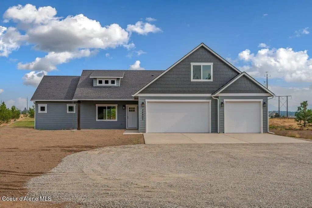 Completed new construction on 5 acres. The North Fork Bonus 3 car plan features a single level open concept plan with bonus room over garage. Features and upgrades include water resistant laminate flooring, soft-close cabinetry, quartz countertops, matte black finishes, kitchen island with pendant lights, black stainless steel appliances with refrigerator, painted fiber cement lap siding with shake accent.