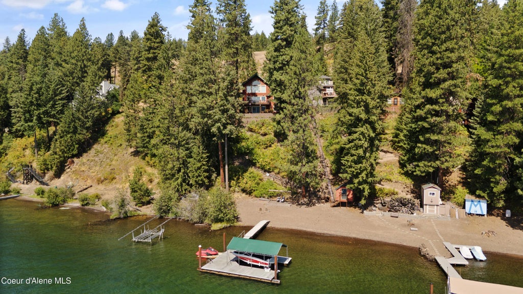 Welcome to this meticulously maintained ultimate year-round living waterfront retreat on Coeur d'Alene Lake in Rockford Bay just below Black Rock Golf Course. This custom-built, 4-bedroom, 2-bath home features 100 feet of pristine lake frontage, beautifully crafted custom wood work through the home, a newer tram, a covered boat slip, boat lift and jet ski dock, a spacious open deck that frames gorgeous views of the lake and mountains, 2 fireplaces, a loft to accommodate extra quests, air conditioning, a radon mitigation system,and a walkout basement with extra flex space and storage. Additional amenities include a beach storage shed, a retractable beach shade, dog kennel, security system, 2 hot water tanks, water filtration system, water softener, and ample parking. Minutes by boat to the multiple restaurants on the lake...It's not just a home; it's a lifestyle.