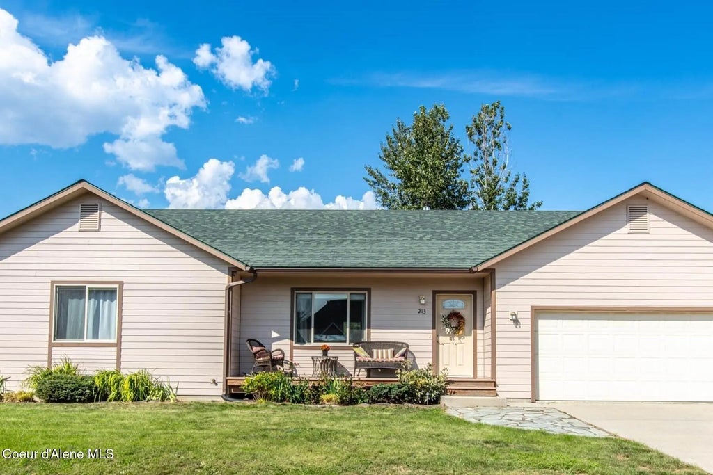 This well-maintained 3-bed, 2-bath home offers 1,724 sq ft of comfortable single-level living in a desirable neighborhood. Features include an open-concept kitchen and dining area, a generous kitchen with bar seating, and a dining room that opens to a beautiful Montana flagstone patio. Enjoy a bright and spacious living room, a separate laundry and storage area, and an attached finished garage. The primary suite includes a walk-in closet and en-suite bathroom, while the guest bedrooms are well-sized, with a full bath featuring a low-clearance walk-in shower. Fully fenced backyard is landscaped with rock work, raised garden beds, perennials, three columnar apple trees, and a Japanese crab apple tree—all with views of Schweitzer Mountain Resort. There's a paved driveway with an extra parking pad, backup generator, and three storage sheds (8x12, 8x14, 8x16)